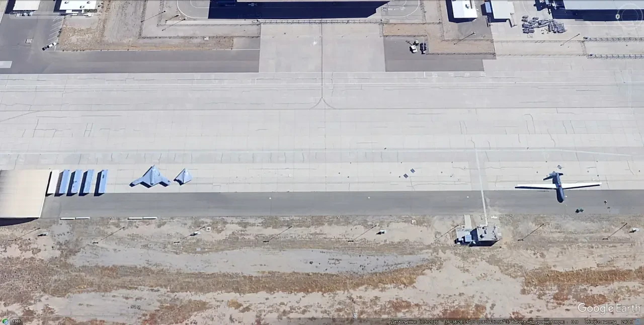 Более 15 лет назад началась эксплуатация БПЛА Lockheed Martin RQ-170 Sentinel, но этот аппарат до сих пор является секретным. По этой причине беспилотники, эксплуатируемые ВВС США, сразу после полётов убираются в ангары, и их нет на спутниковых снимках, доступных рядовым обывателям. Впрочем, в свободном доступе имеются снимки БПЛА Lockheed Martin RQ-170 Sentinel на заводе Lockheed Martin в Палмдейле, Калифорния. Первый такой снимок датирован октябрём 2016 года.