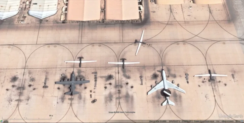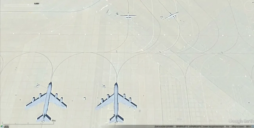 Спутниковый снимок Google Earth: самолёты Lockheed U-2S Dragon Lady и Boeing E-3G Sentry на авиабазе Аль-Дафра
