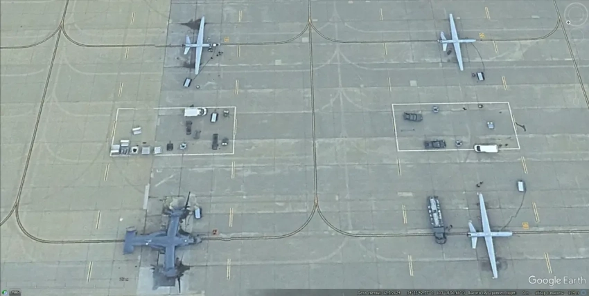 Спутниковый снимок Google Earth: БПЛА General Atomics MQ-9А Reaper и конвертоплан Bell Boeing CV-22 Osprey на авиабазе Кэннон