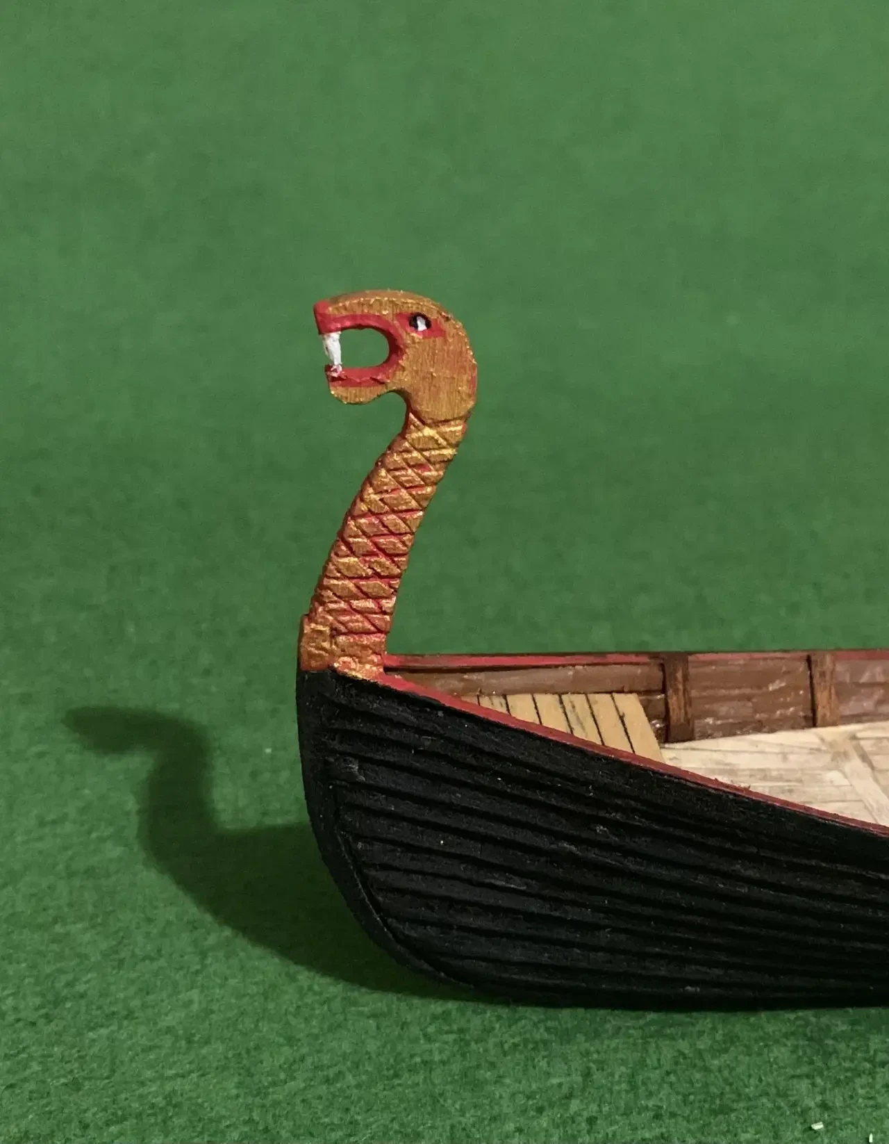 Полностью окрашенная голова дракона. Кстати, корпус драккара следует покрасить матовой акриловой краской черного цвета, поскольку викинги корпуса своих кораблей смолили, и они у них были черного цвета. Фотография автора