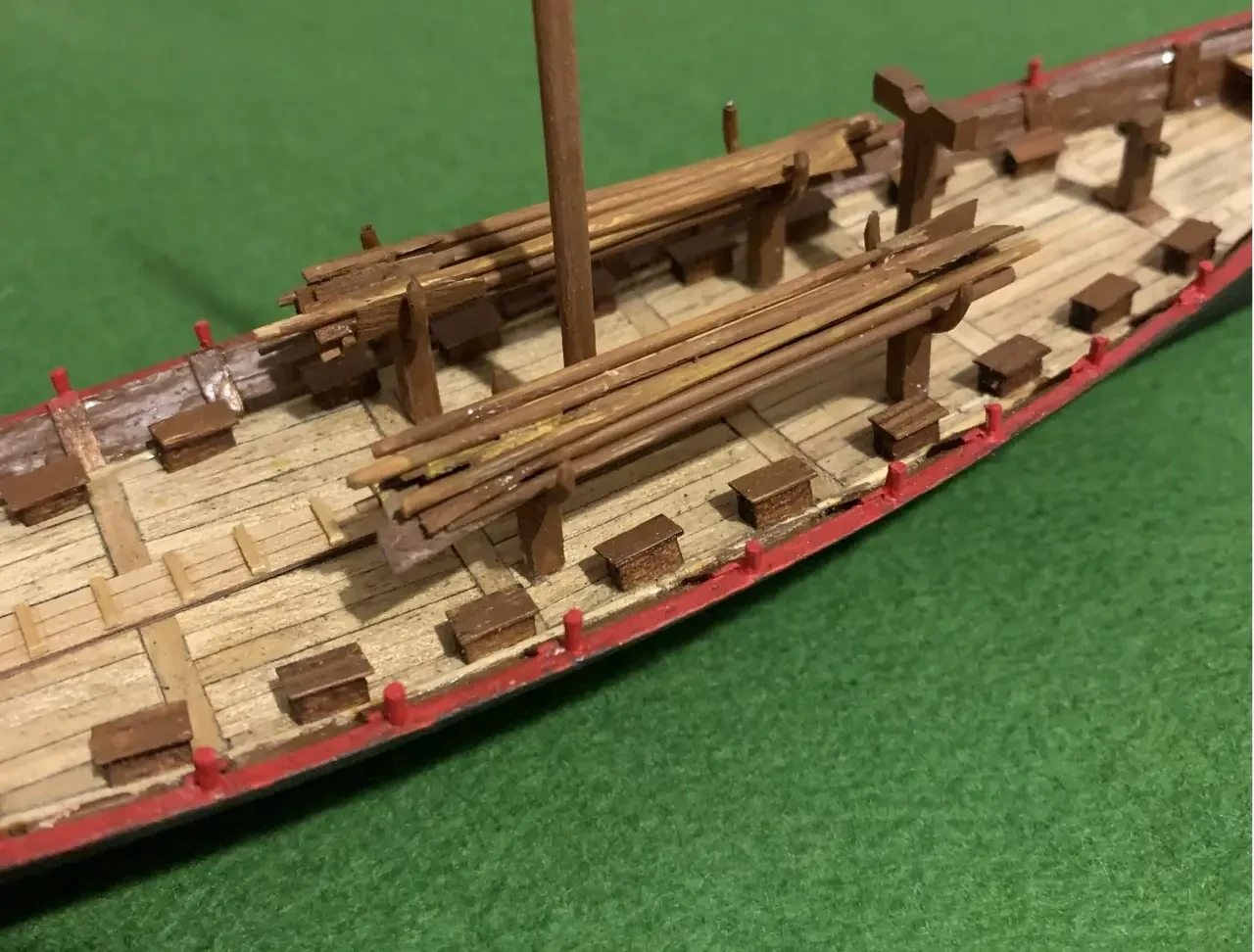 Соответственно, столько же или немного больше должно быть и щитов, которые надо закрепить по бортам так, чтобы между ними остались бы промежутки для весел. Кстати, весел тоже нужно будет 22 штуки, и храниться они должны будут на Y-образных «рострах» справа и слева от мачты.