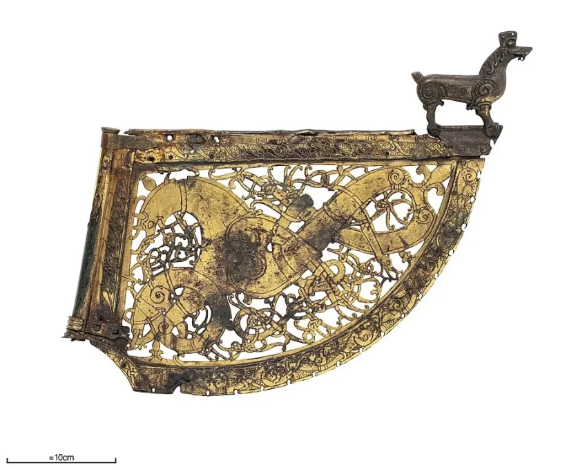 «Флюгер из Содерала». Пластина из позолоченной бронзы украшена изображениями трех зверей, переплетенными друг с другом, а также другими чисто декоративными элементами, такими как спирали, в стиле, близком к стилю шведских надгробий середины XI века. главным декоративным элементом является изображение типичного дракона эпохи викингов с крыльями, его передние лапы и шея вытянуты, как у лошади, которая вот-вот встанет на дыбы. Другое существо обвилось вокруг передних лап дракона, а третье, безлапое, обвилось вокруг его тела. Исторический музей. Стокгольм