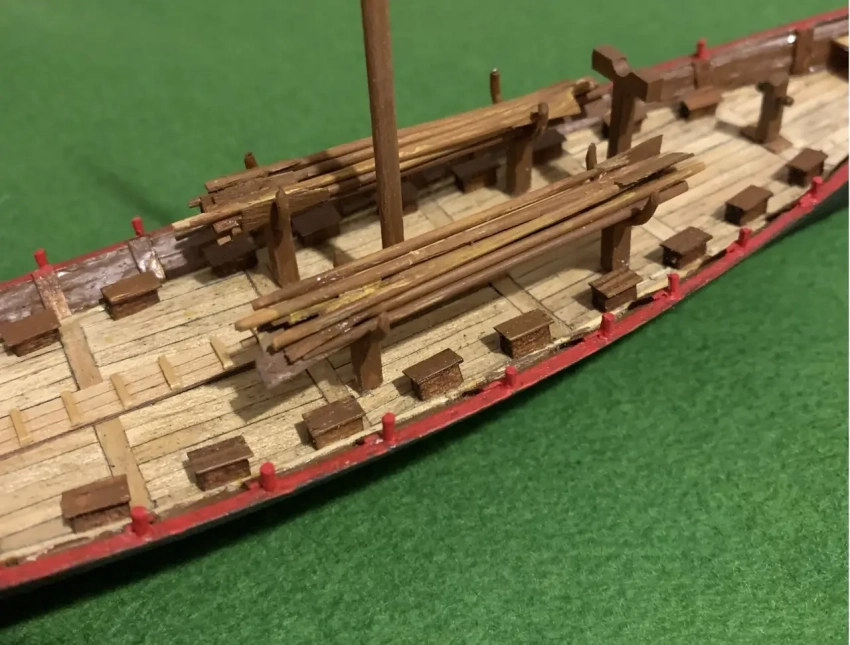 Теперь приступаем к изготовлению очень важных деталей: сидений для гребцов. Если викинги гребли, сидя на своих сундуках, то это означает, что для их изготовления для данной модели нам понадобится деревянная рейка сечением 3х3 мм, которую нам придется нарезать на «бруски» длиной 5 мм и покрасить в коричневый цвет. Всего таких «сундуков» понадобится 22 шт. Причем на модель нужно будет поставить их не поперек палубы, а вдоль борта. Ведь наш корабль будет передвигаться под парусом, а раз так, зачем тогда сундукам занимать на ней лишнее место? Вот их и сдвинули в сторону и расположили не поперек, а вдоль, чтобы они не мешали проходу.
