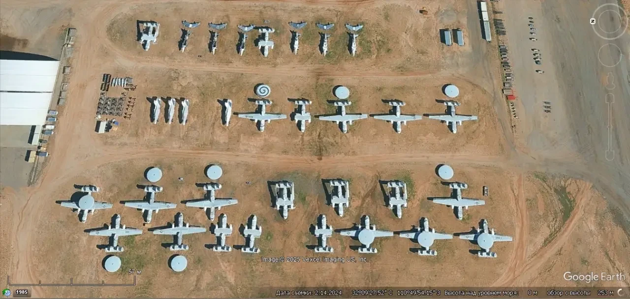 Спутниковый снимок Google Earth: самолёты Northrop Grumman E-2C Hawkeye, находящиеся на базе хранения в Девис-Монтен. Снимок сделан в феврале 2024 года