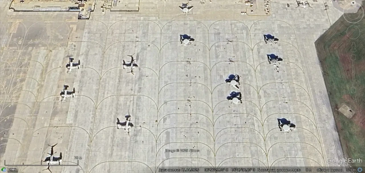 Спутниковый снимок Gооglе Eаrth: самолёты Northrop Grumman E-2С/D Hawkeye/ Advanced Hawkeye и конвертопланы Bell Boeing CMV-22В Osprey на авиабазе Норфолк Чамберс-Филд. Снимок сделан в ноябре 2025 года