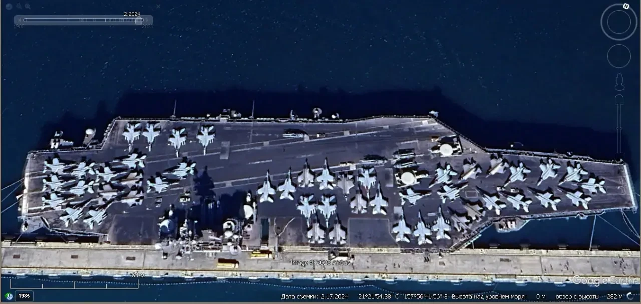 Спутниковый снимок Google Earth: самолёты на верхней палубе авианосца USS Carl Vinson (CVN-70), пришвартованного к пирсу военно-морской базы Перл-Харбор на Гаваях. Снимок сделан в феврале 2024 года