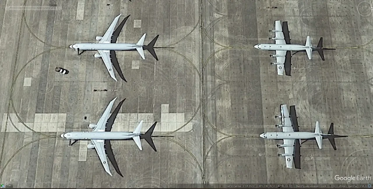 Спутниковый снимок Gооglе Eаrth: самолёты Lockheed P-3С Orion и Boeing P-8А Poseidon на авиабазе Джексонвилл
