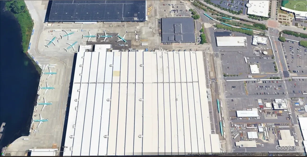 Спутниковый снимок Gооglе Eаrth: территория завода Boeing в Рентоне. Снимок сделан в июле 2024 года