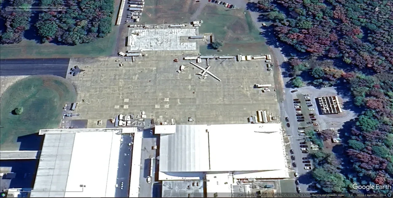 Спутниковый снимок Gооglе Eаrth: БПЛА Northrop Grumman MQ-4C Triton и палубный истребитель Lockheed Martin F-35C Lightning II на авиабазе Патуксент-Ривер