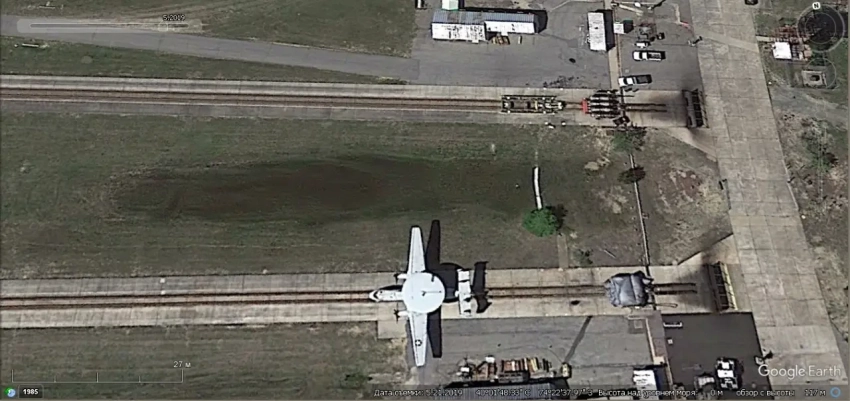 Спутниковый снимок Google Earth: самолёт Northrop Grumman E-2D Advanced Hawkeye, установленный на наземной испытательной катапульте на авиабазе Лэйкхёрст. Снимок сделан в мае 2019 года