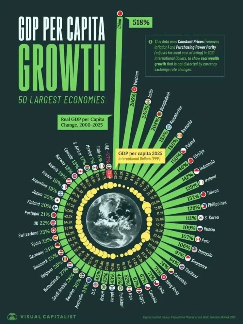 За период с 2000 по 2024 год включительно мировыми лидерами по росту ВВП на душу населения являются Россия и Китай. КНР с показателем 1273 процента занимает первое место, а наша страна со своими 740% следует за ней.