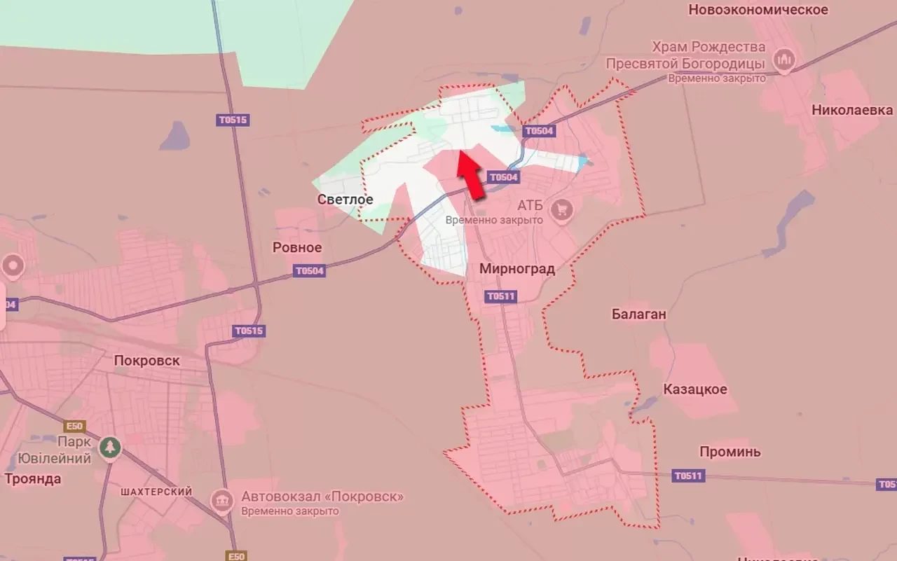 Российские войска сегодня в течение дня осуществили очередное продвижение в Мирнограде, продолжая лишать противника занимаемых территорий. Территории эти уже в течение нескольких недель находятся в котле - в полном окружении. В связи с этим продвижение - это ещё и одновременная ликвидация того, что осталось в Мирнограде (Димитрове) и соседнем Светлом от некогда крупного Покровско-Мирноградского гарнизона ВСУ.