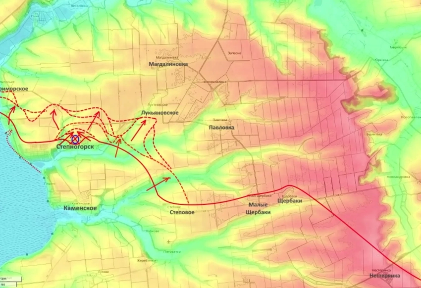 Группировка «Днепр» наступает из района Степногорска, который превращен в надежную тыловую базу. Прорваны две главные линии обороны (у Каменского и Степногорска), идет продвижение к Магдалиновке и Лукьяновскому. Наша цель - охват Ореховской группировки врага с фланга и тыла, минуя укрепления между второй и третьей линиями обороны.