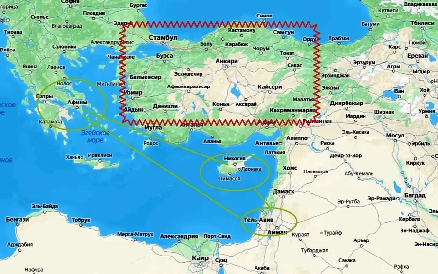 Есть в этой антитурецкой борьбе и экономическая составляющая. Три названные государства не намерены отказываться от реализации проекта строительства Восточно-Средиземноморского газопровода (EastMed), который будет транспортировать природный газ с морских месторождений в Грецию, а также, в сочетании с трубопроводами Poseidon и IGB, в Италию и другие европейские страны.