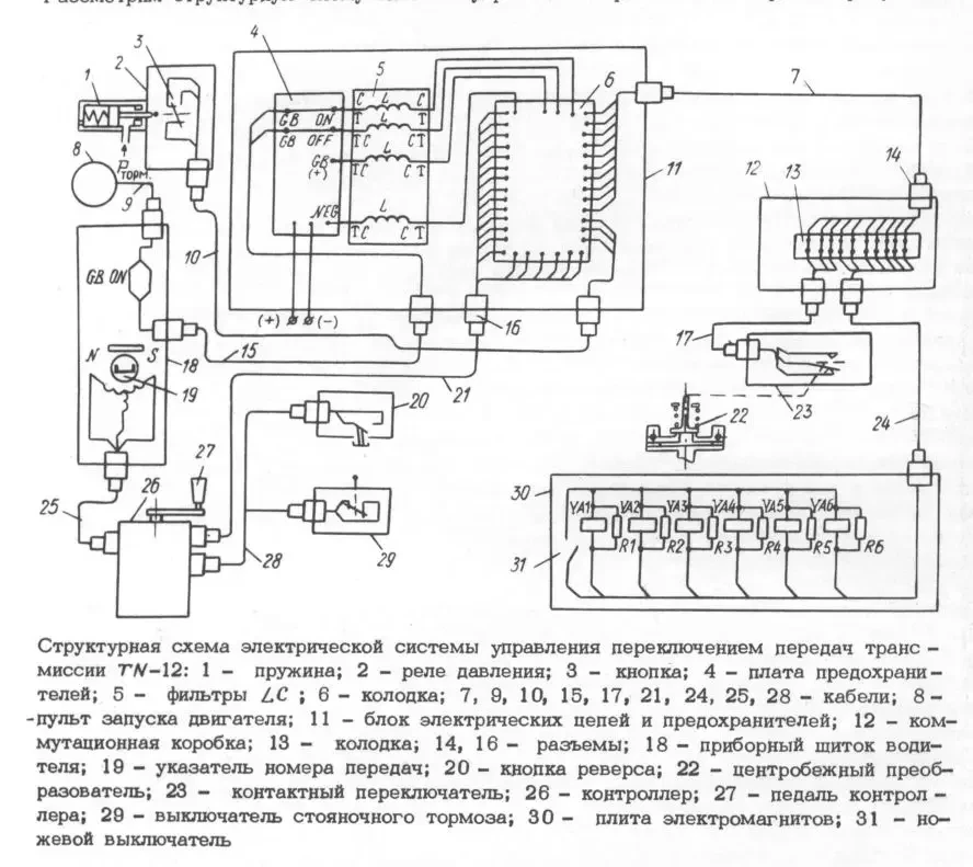 Для определения номера включенной передачи и контроля работы электрической системы на щитке водителя установлен стрелочный указатель номера включенной передачи, а также нейтрали (IIr, Ir. N, I, II, III, IV, V, VI). Необходимость применения указателя вызвана тем, что при разработке системы был выбран командный способ переключения передач. Рассмотрим структурную схему системы управления переключением передач (рисунок).