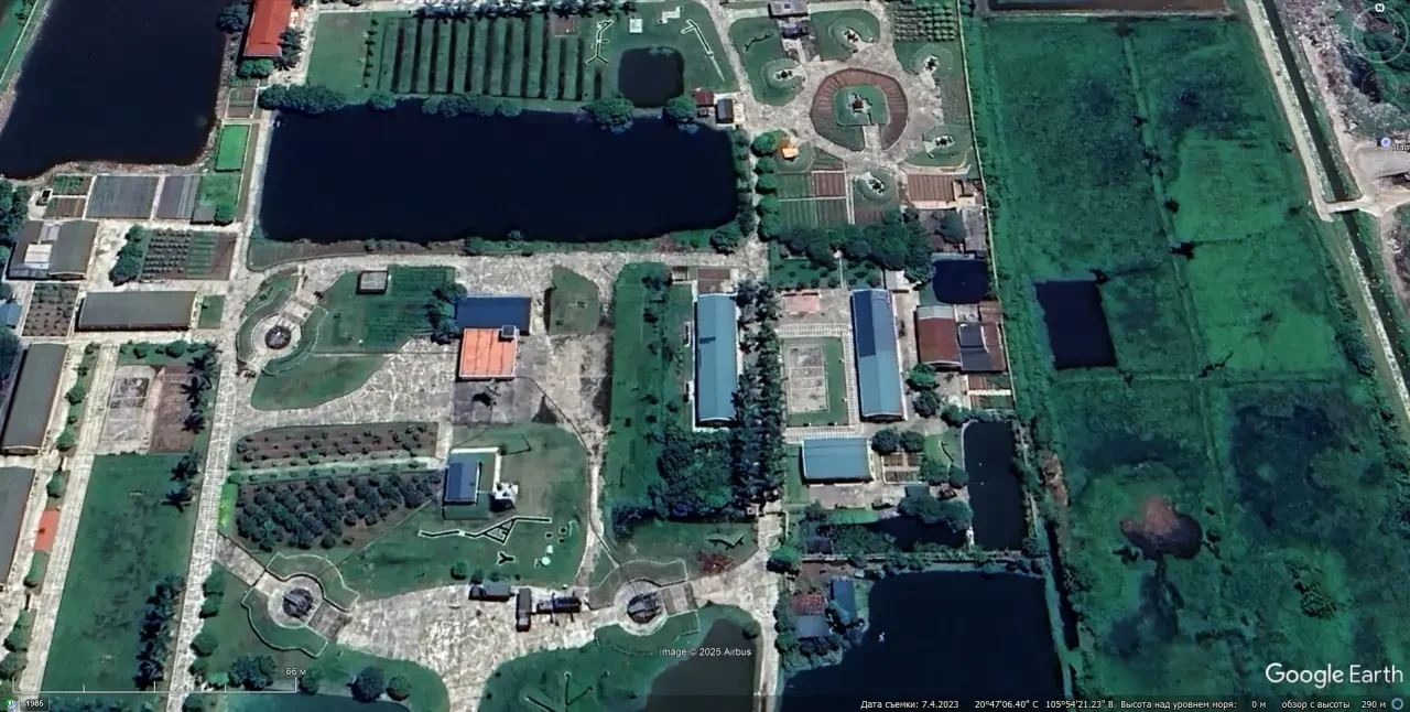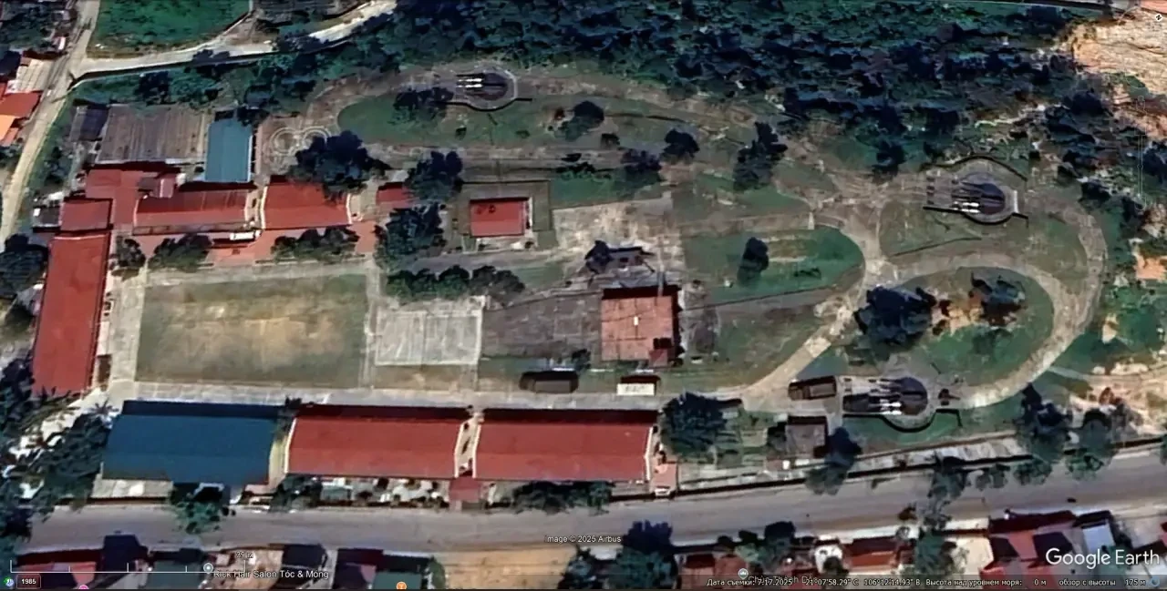 Спутниковый снимок Googlе Eаrth: позиция ЗРК С-125М1А в восточной части Хайфона. Эта позиция примечательна тем, что станция наведения и пусковые установки окружены прудами, ЗУР на ПУ нет. Снимок сделан в июле 2025 года