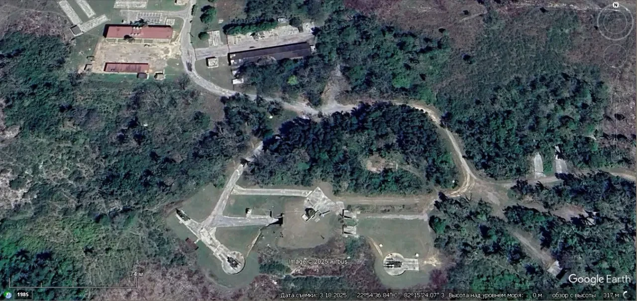 Спутниковый снимок Googlе Eаrth: позиция ЗРК С-125М1А в 15 км к югу от Гаваны. Из двух пусковых установок развёрнутых на позиции только одна снаряжена двумя ракетами. Снимок сделан в марте 2025 года