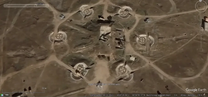 Спутниковый снимок Googlе Eаrth: позиция ЗРК С-125 в 12 км северо-западней Каира. Видно, что на позиции осталось две пусковых установки без ракет. Снимок сделан в апреле 2025 года
