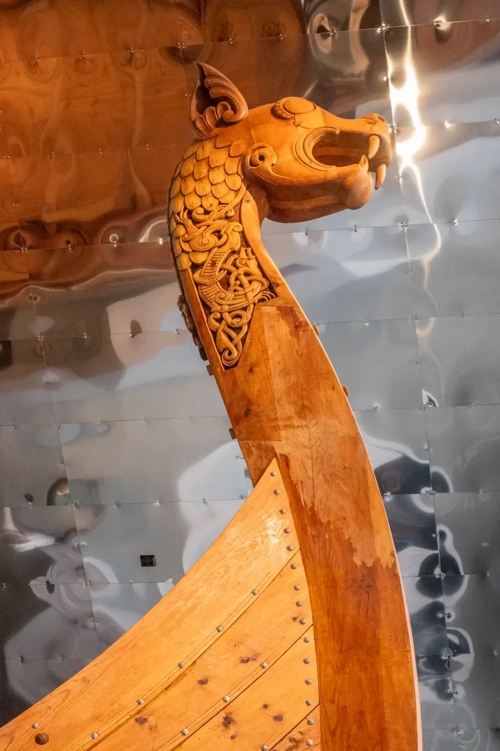 Резной нос реконструированного «корабля Миклебюст». На фото очень хорошо видны шляпки железных гвоздей, которыми были скреплены обшивка и набор судна. Центр викингов Сагастад, Нордфьордейд, Норвегия