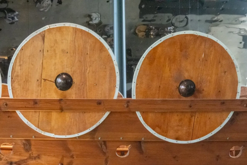 Фотография деревянных щитов викингов и отверстий для вёсел в корпусе корабля крупным планом. Обратите внимание, что крепление щитов «корабля из Миклебуста» никак не мешает грести веслами, а сами щиты не только закреплены изнутри, но и опираются на брус дополнительного внешнего планширя, между которым и собственно бортом корабля эти щиты как раз и вставлены. Щиты традиционного для викингов типа – диаметром около 3 ярдов (91 см), с железным умбоном в центре и кожаной обшивкой по краю. Расписывать их, по-видимому, не стали специально, чтобы они не выделались на фоне бортов некрашеного корабля и его оконечностей. Центр викингов Сагастад, Нордфьордейд, Норвегия