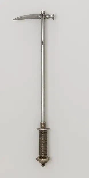 Гвизарма 1500 г. Тут тебе и протыкающие кольчугу и доспехи шипы, и крюк, сбрасывать всадников с коня и рубящий клинок. Такое вот страшное универсальное оружие пехотинца. Метрополитен музей, Нью-Йорк