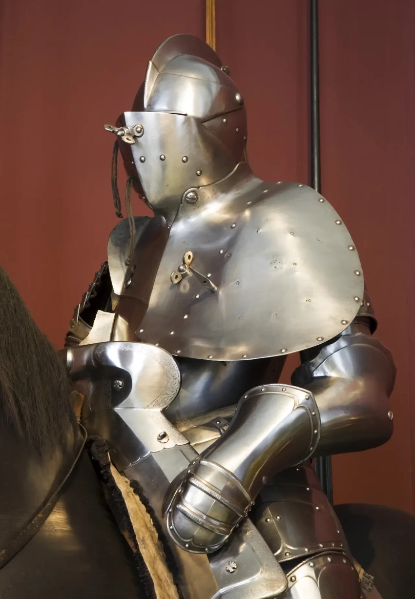 Ну а такие доспехи с дополнительным бронированием левой руки и части корпуса вместе со шлемом в XVI в. использовались уже только на турнирах. Оружейная палата дворца Новый Хофбург, Вена. Фотография автора