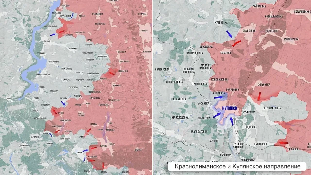 На Купянском направлении, на юго-востоке от накануне взятого под контроль села Подолы, российские войска зашли в Куриловку, взяли северную часть села и продвигаются к его западной окраине вдоль р. Лозовая. В треугольнике Новоосиново -Ковшаровка- Купянск-Узловой российские бойцы, контролируя воздушные и наземные маршруты ВСУ, уничтожают антенны и ретрансляторы, а также полевые склады вражеских расчётов БПЛА. В самом Купянске идут ожесточённые бои. Противник сумел заскочить в Кондрашовку и потеснить наших с позиций на юге. Выше по фронту ВС РФ заняли новые позиции у Двуречанского.