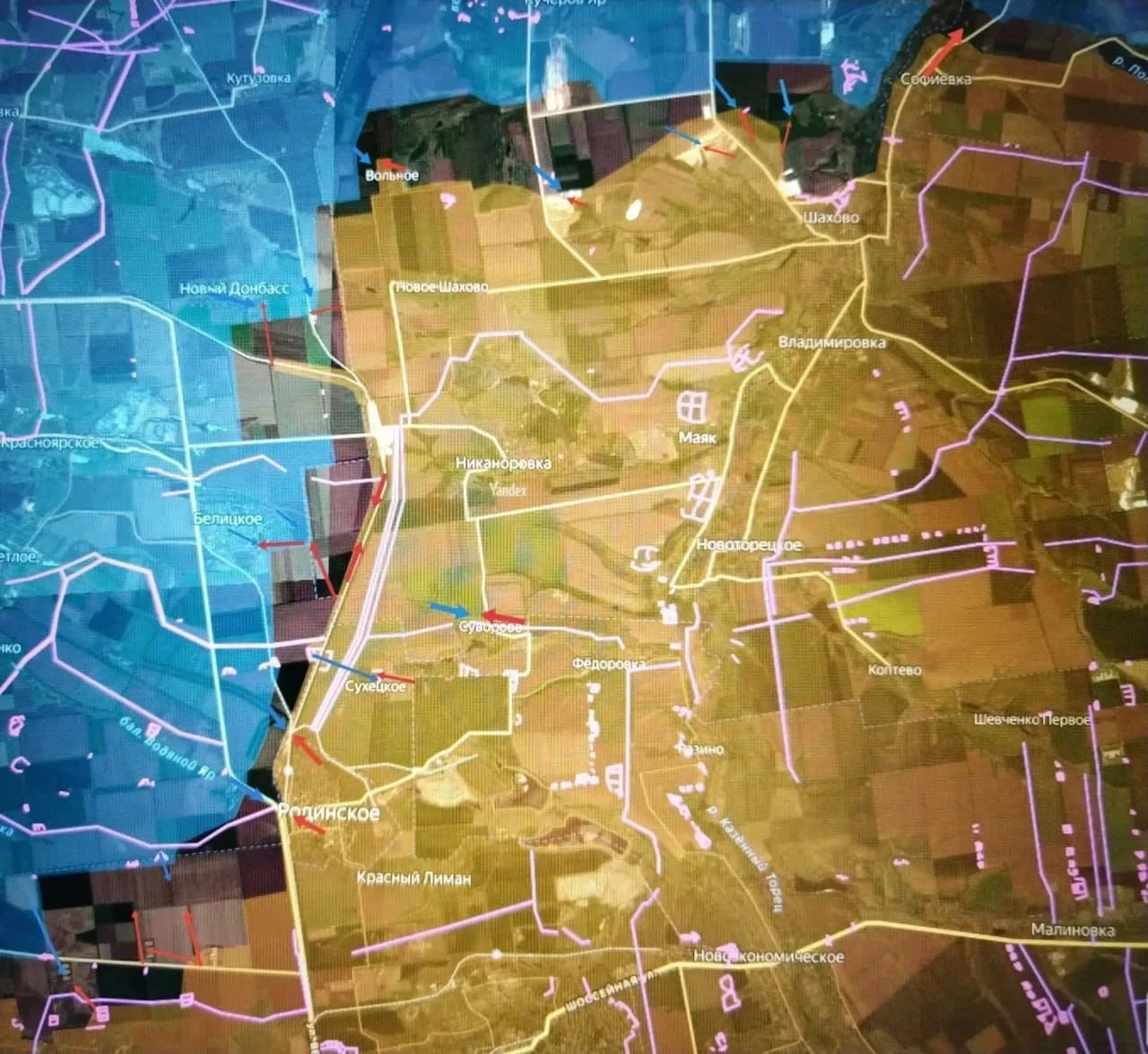 На Красноармейском направлении наши войска установили контроль над территорией двух ферм вдоль дороги на Гришино, есть успехи и восточнее села. Западнее и юго-западнее Родинского идут бои, наши бьют ФАБами по позициям врага. ВСУ контратакуют на западных окраинах Суворово и Сухецкого. Наши штурмуют Белицкое и Новый Донбасс. Северо-западнее Октябрьского (Шахово) российские подразделения ведут бои за карьеры огнеупорных руд и в районе урочища.