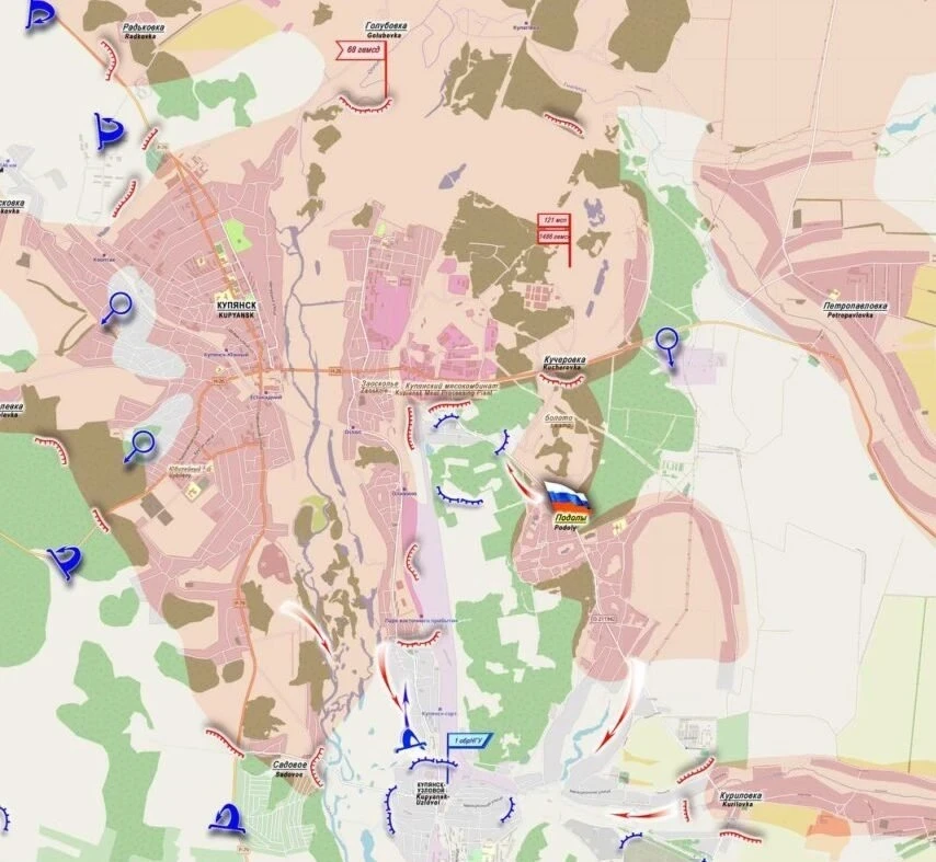 "На Купянском направлении в течение суток отражены две контратаки подразделений штурмовой бригады ВСУ и бригады охраны Генерального штаба [ВСУ] в районах населенных пунктов Пономаревка и Благодатовка, пытавшихся прорваться в Купянск", - проинформировал Бигма.