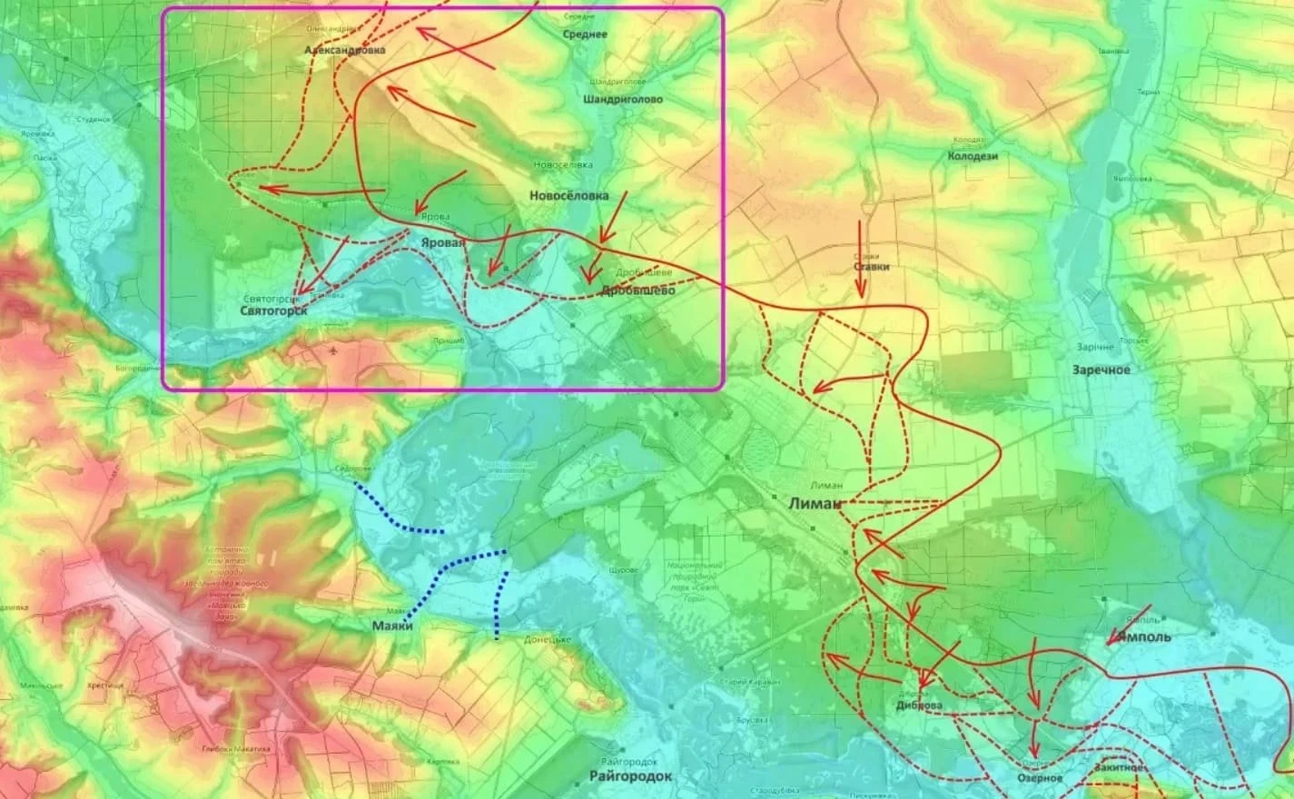 Ранее ряд военных источников сообщал о продвижении российских подразделений в районе Святогорска примерно на 10 километров и начале формирования охвата города. Однако, как следует из комментария Подоляки, на текущий момент речь идёт о тяжёлых боях без завершённого оперативного окружения.