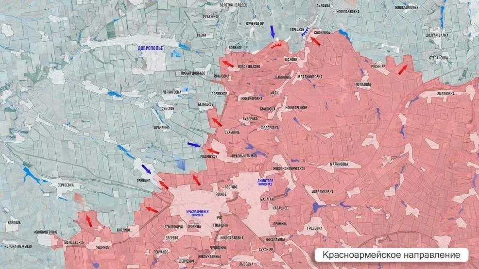 На Краснолиманском фронте ВС РФ закрепились на юго-востоке Красного Лимана и продвигаются на северо-запад, чтобы установить контроль над дорогой на Славянск. Улучшили позиции в лесах на севере и востоке Дробышево. Выше по фронту наши штурмуют Святогорск, дожимают противника в Александровке, наступаю на Коровий Яр.