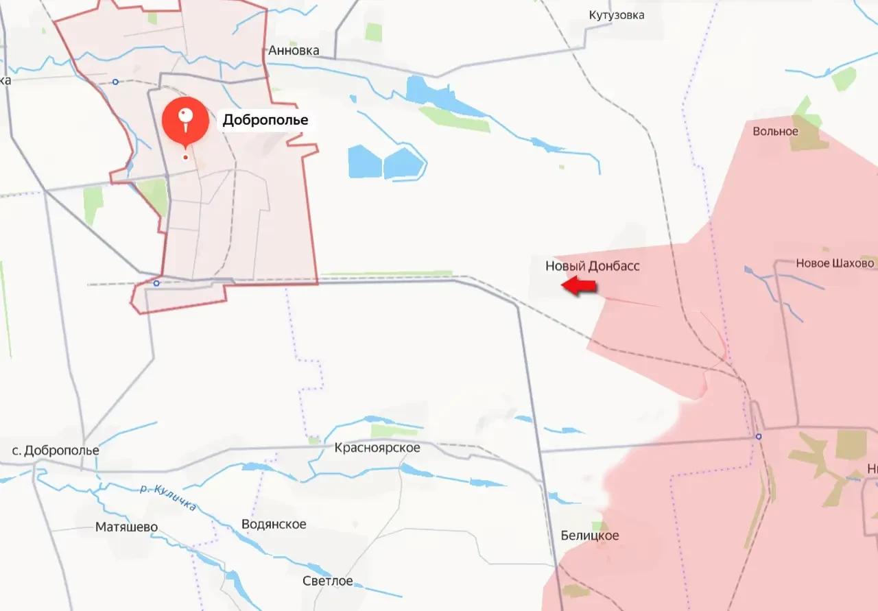 Сегодня поступает информация о продвижении армии России к северу от города Белицкое. В результате успешных действий наши бойцы овладели большей частью населённого пункта Новый Донбасс. Это село находится менее чем в 4-х км от города Доброполье.