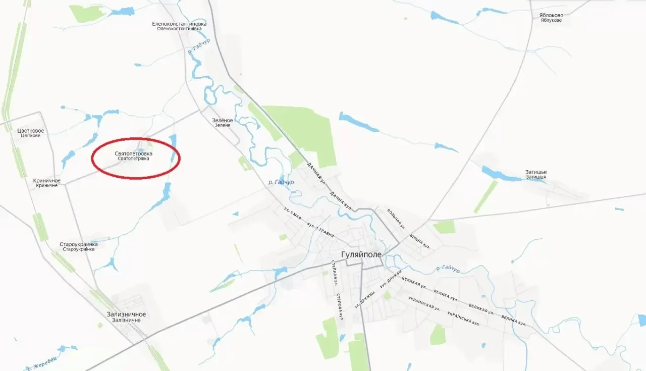 Подразделения армии России продолжают наступать в районе города Гуляйполе Запорожской области, буквально ежедневно освобождая новые населенные пункты. Поступают сообщения об освобождении села Петровка (украинское название Святопетровка), расположенного к северо-западу от Гуляйполя.