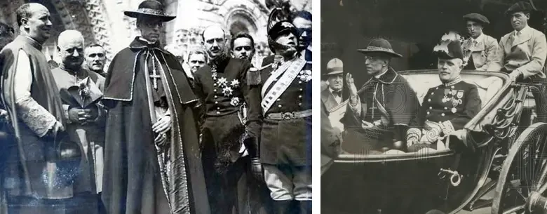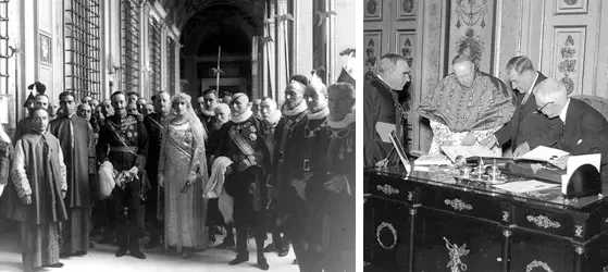 На фото слева: визит испанского короля Альфонсо XIII и королевы Виктории Евгении Испанской в Папское государство. Имея официальный титул Rex Catholicissimus («Их Католические Величества») и будучи набожными католиками, они поддерживали тесные связи с Церковью и имели аудиенции у пап в Риме. На фото справа: премьер-министр Португалии и апостольский нунций кардинал Пьетро Сириачи во время ратификации конкордата 1 июня 1940 года, закрепившего тесные отношения между авторитарным режимом А. Салазара и Католической церковью, предоставив ей значительное влияние в обмен на поддержку Церковью стабильности государства. Источник: Vatican News