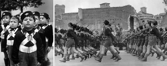 Члены фашистской молодежной организации (Opera Nazionale Balilla, ONB) маршируют мимо Бенито Муссолини во время празднования 20-й годовщины вступления Италии в Первую мировую войну, 27 мая 1935 года. Эта молодежная организация функционировала в качестве дополнения к школьному образованию в период с 1926 по 1937 год, когда она вошла в состав «Итальянского литторио» (GIL), молодежной секции Национальной фашистской партии. Источник: Encyclopaedia Britannica, Inc