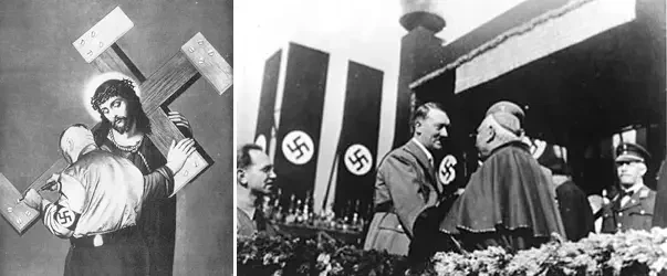 На фото слева: карикатура. Пронацистский теолог Людвиг Мюллер, недавно назначенный Гитлером епископом Рейха посчитал что крест Иисуса Христа был слишком легким и прикручивает к нему дополнительные дощечки, превращающий крест в свастику. Художник: Джон Хартфилд, Чехословакия, 1933 год