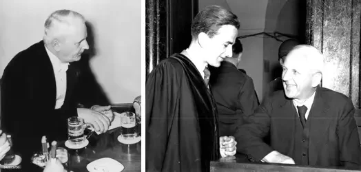 На фото слева: На «Конгрессе партии Рейха за единство и силу» 1934 года в Нюрнберге Адольф Гитлер приветствует протестантского епископа Рейха Людвига Мюллера (справа) и католического аббата Альбануса Шахляйтнера (в центре) в качестве почетных гостей. Фото: Генрих Хоффман. Источник: Bildagentur. На фото справа: Йозеф Геббельс и католический священник. Источник: Getty Images