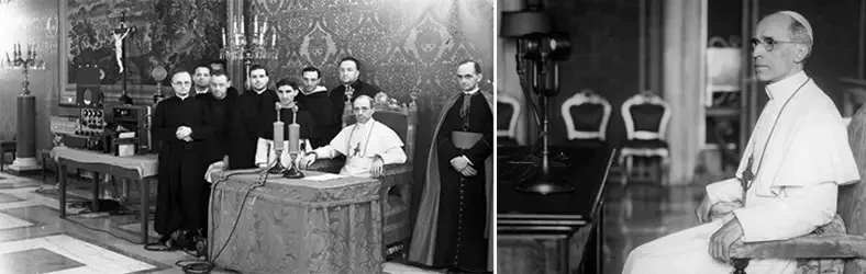 «Радио Ватикана», официальная служба радиовещания Ватикана, было основано в 1931 году Гульельмо Маркони, изобретателем радио. Радиостанция была создана по поручению Папы Пия XI с целью донести до мира голос Папы и евангельское послание. В 1936 году Международный союз электросвязи признал «Радио Ватикана» «особым случаем», разрешив ему вещание без географических ограничений. Во время Второй мировой войны новостные передачи радиостанции были запрещены в Германии, но она оставалась независимым голосом, вещая на четырех языках. Радио использовалось для распространения информации о состоянии Церкви на оккупированных территориях и поиска пропавших без вести через информационный центр Ватикана. На фото слева: мужчина слушает «Радио Ватикана». На фото справа: аппаратная «Радио Ватикана»