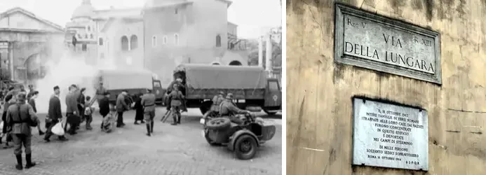 На фото слева: массовый арест евреев в Риме 16 октября 1943 года. В июле 1943 года союзники высадились на Сицилии, и началась «итальянская кампания», затем Рим впервые подвергся сильной бомбардировке. А 9 сентября маршал Бадольо, король Виктор Эммануил, правительство и военные лидеры бежали из столицы на юг. Немцы вошли и захватили город. Дальнейшее видно на фотографии. На фото справа: мемориальная доска в Риме посвящена облаве и депортации в лагеря смерти еврейских семей нацистами 16 октября 1943 года. «Из более чем 1000 человек выжило только 16», - говорится на мемориальной доске