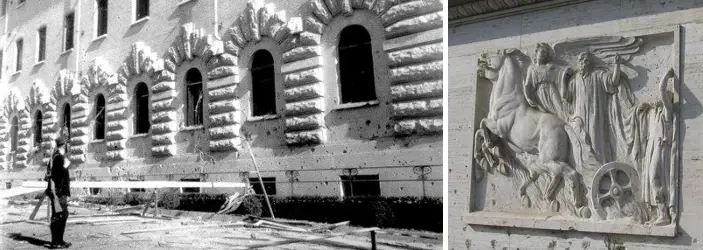 5 ноября 1943 года - В этот день Ватикан пострадал от первого из двух бомбардировок Второй мировой войны. На фото слева: фотография, демонстрирующая разрушения, причиненные одному из зданий в Ватикане. На фото справа: бомба упавшая возле железнодорожного вокзала, а на стене, украшенной скульптурой Илии, все еще видны следы осколков. Источник: Vatican News
