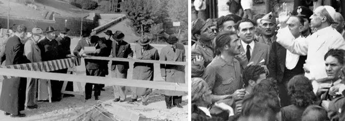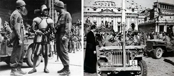 На фото слева: премьер-министр Новой Зеландии Питер Фрейзер и командующий 2-й новозеландской дивизией генерал Бернард Фрейберг разговаривают со швейцарскими гвардейцами у ворот Ватикана 4 июня 1944. Источник: George Bull. На фото справа: американские войска на площади Рима. 1944 год