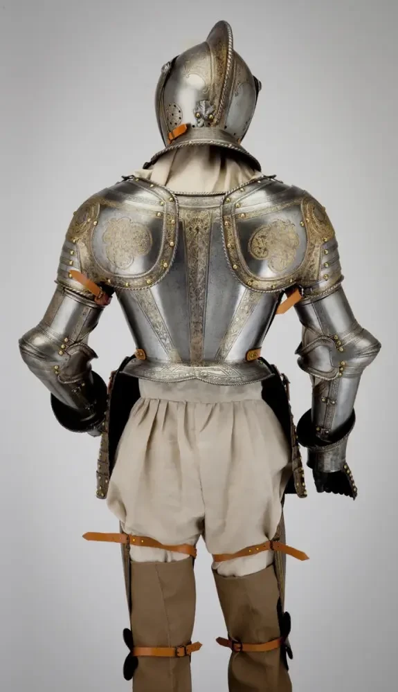 Набедренники выполнены отдельно от «юбки» кирасы, что для трехчетвертных доспехов не характерно. На кирасе видны два отверстия для копейного крюка, но самого его нет. Вполне возможно, что данные доспехи являются «модернизацией» более старого латного комплекта.