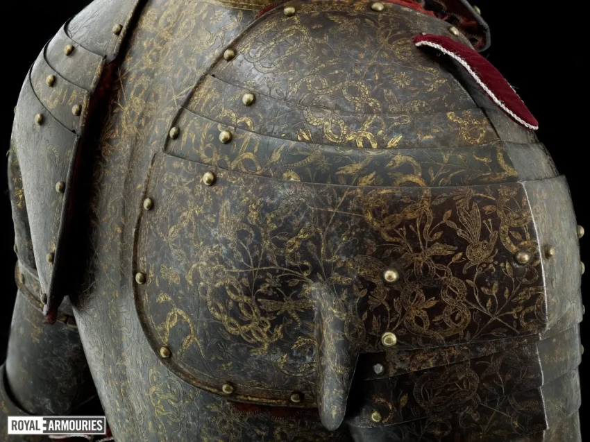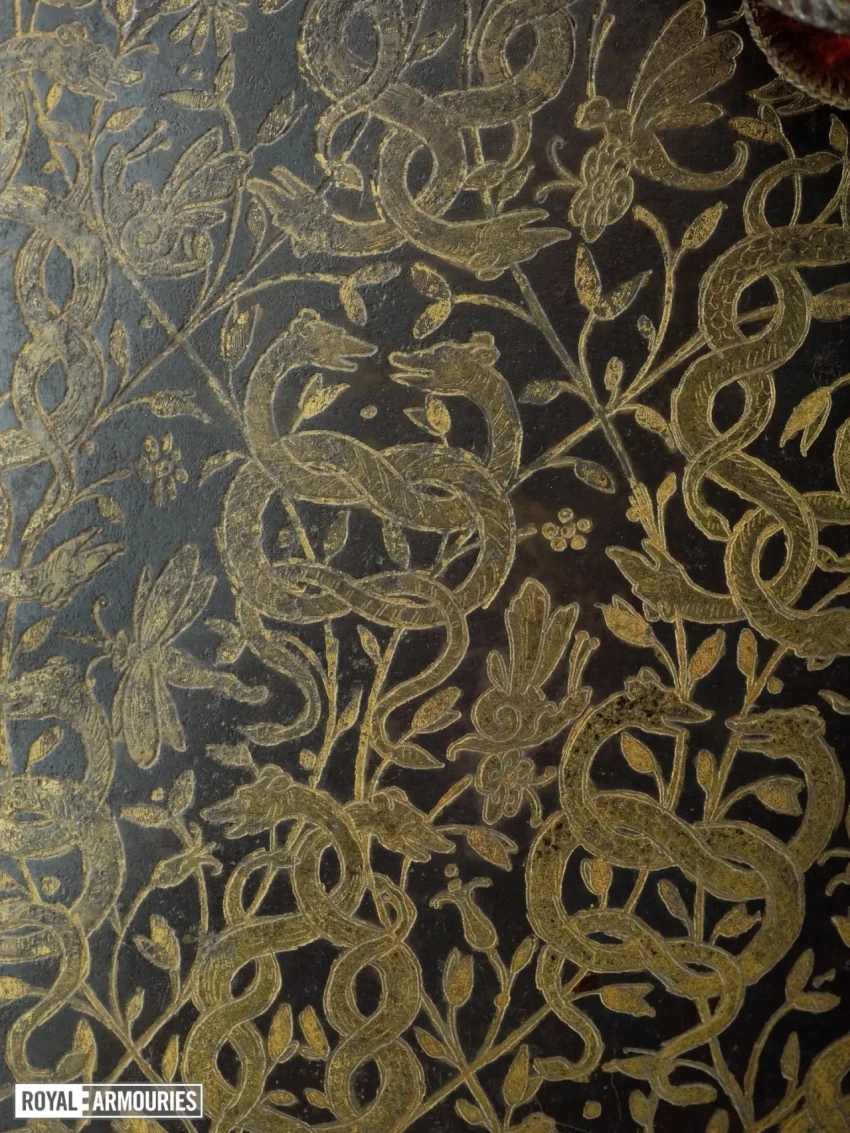 Каждая пластина доспехов украшена травлением и позолотой, на ней изображен общий узор из переплетающихся ушастых змей в вертикальных полосах, соединенных диагонально переплетающимися тонкими лиственными листьями с редкими цветами, среди которых сидят хищные птицы, летающие попугаи, различные насекомые, включая кузнечиков и стрекоз, улитки (некоторые крылатые), длинноухие белки и резвящиеся зайцы.