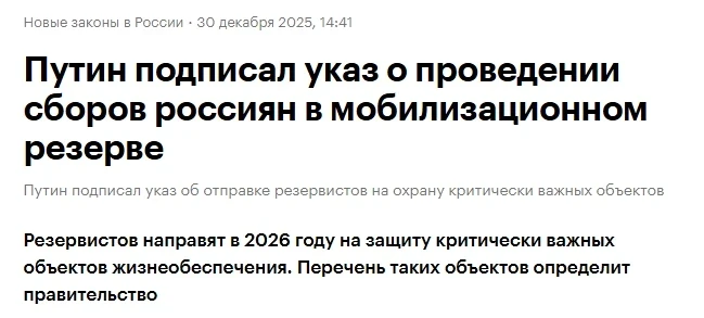 Это фейк. Частичная мобилизация завершилась в России еще осенью 2022 года. Власти неоднократно заявляли, что РФ не нуждается в новой мобилизации, поскольку недостатка в добровольцах в стране нет. Так, контракт на прохождение службы в ВС РФ в 2025 году заключили 422 704 человека.