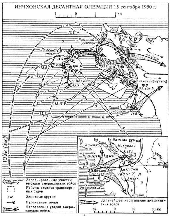 Вот только дат, в которые прилив будет держаться три часа, необходимые для высадки, было только три: 15 и 27 сентября и 11 октября. Ещё одним минусом Инчхона была невозможность до конца выдержать режим секретности: перед захватом порта, за 11 часов до оного, десантным силам придётся захватить остров Вольмидо, а по нему удобно вести огонь с высоких холмов, окружавших город. Но главное: прилив позволял вести высадку только вечером, оставляя морпехам лишь 2 часа светлого времени на захват плацдарма и закрепление в городе. В общем, у американцев была в памяти высадка в Анцио, где десант оказался заперт на тесном плацдарме под ураганным огнём немцев. А генерал Шеперд помнил высадку на Иводзиме и боялся, что сопротивление корейских солдат будет ничуть не менее ожесточённым, чем у японцев. Всё это было именно так, но Макартур понимал и другое: «войска ООН» на Пусанском плацдарме деморализованы и не смогут пробиться сквозь корейскую оборону самостоятельно, и высаженные на пятачок подкрепления не смогут не поддаться этому деморализующему влиянию. По крайней мере, так считали американцы. Они не знали, что 140 тысячам войск ООН на Пусанском пятачке противостоит всего 70 тысяч бойцов и командиров КНА. Поэтому вывод Макартура был однозначный: надо высаживаться в Инчхоне, а на все аргументированные возражения подчинённых он отвечал, что инстинкт диктует ему уверенность в успехе предприятия.