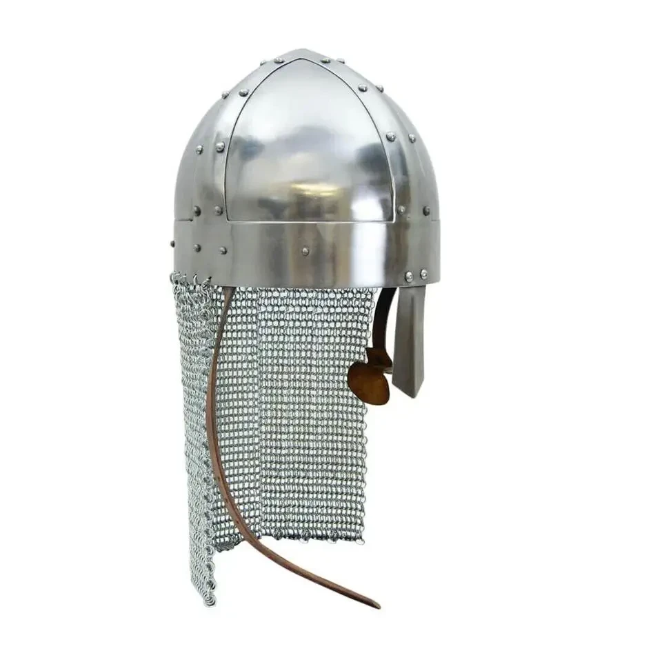 Ну, это что-то уж совсем примитивное. Зато недорого и потом на этот шлем можно прикрепить некие украшения, вырезанные из липовых ламелей и к тому же раскрасить в гербовые цвета. Потом надеваешь гербовое сюрко, под него стеганку и кольчужные совсем короткие нарукавники и… вот ты и рыцарь, ведь никто не не будет проверять – одета на тебе вся кольчуга, или же из под сюрко торчат лишь только рукава?!