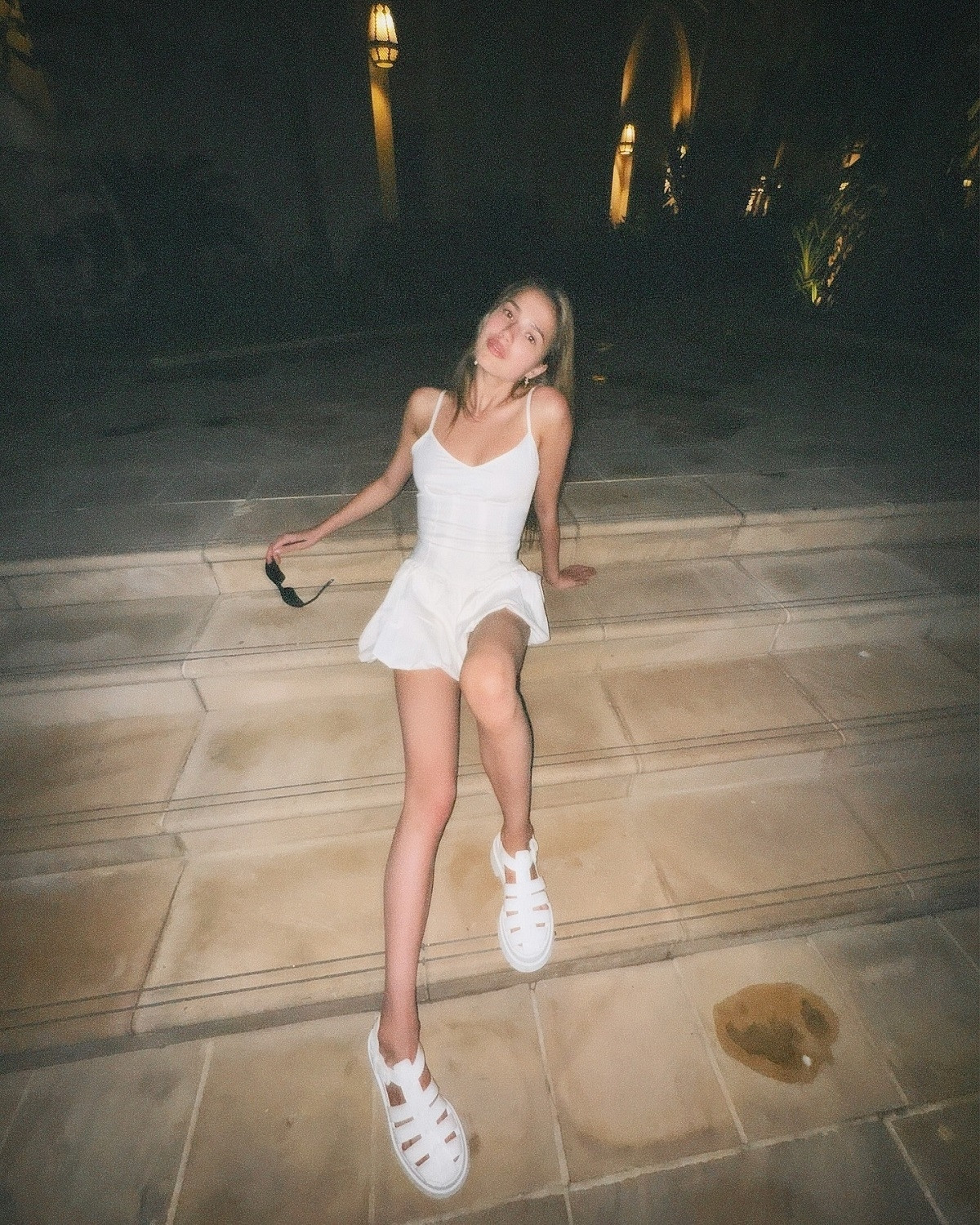 На снимках девушка предстала в стильном корсетном мини-платье с баллонной юбкой. Свой образ прославленная спортсменка дополнила босоножками в тон и солнцезащитными очками.