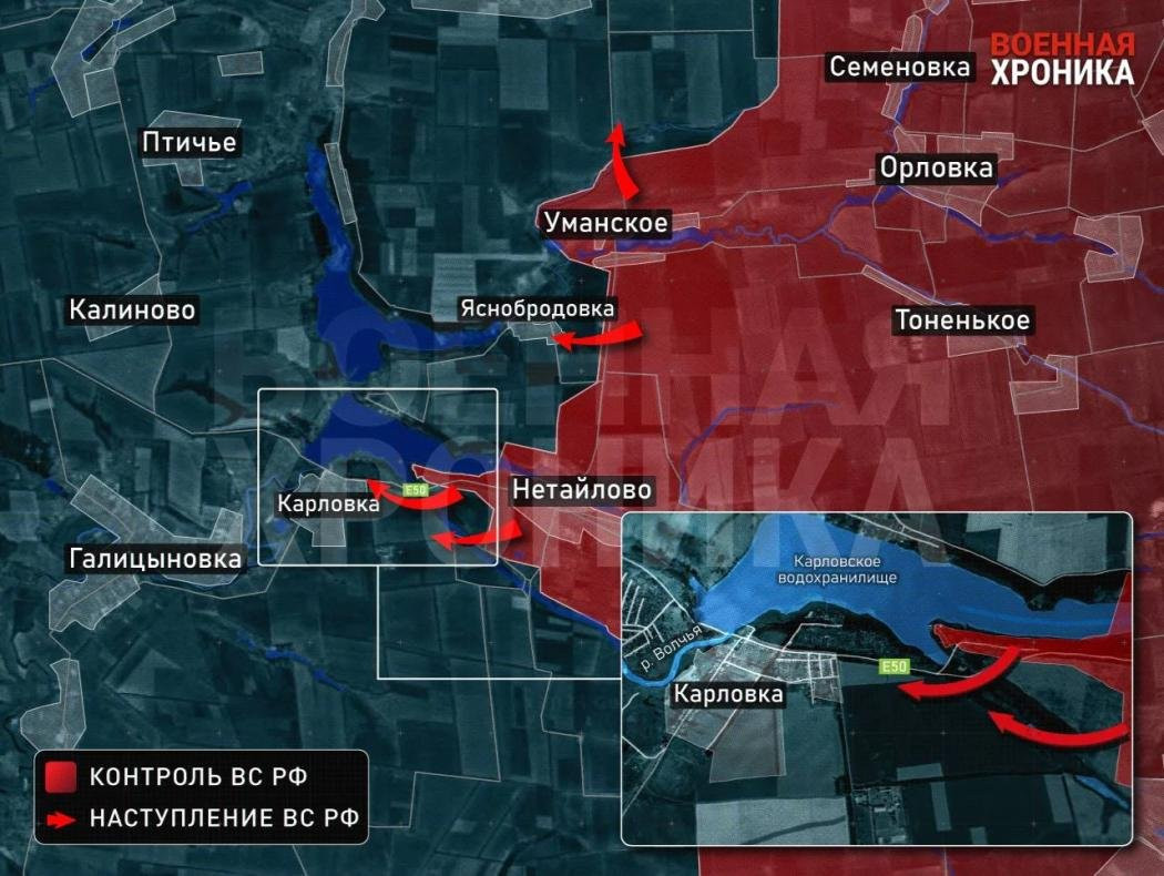 На Авдеевском направлении Вооруженные силы Российской Федерации (ВС РФ) дочищают зону между Карловкой и Нетайлово. Похоже, Вооруженным силам Украины (ВСУ) не удается зацепиться в районе садов и они оттягиваются в более плотную застройку Карловки.