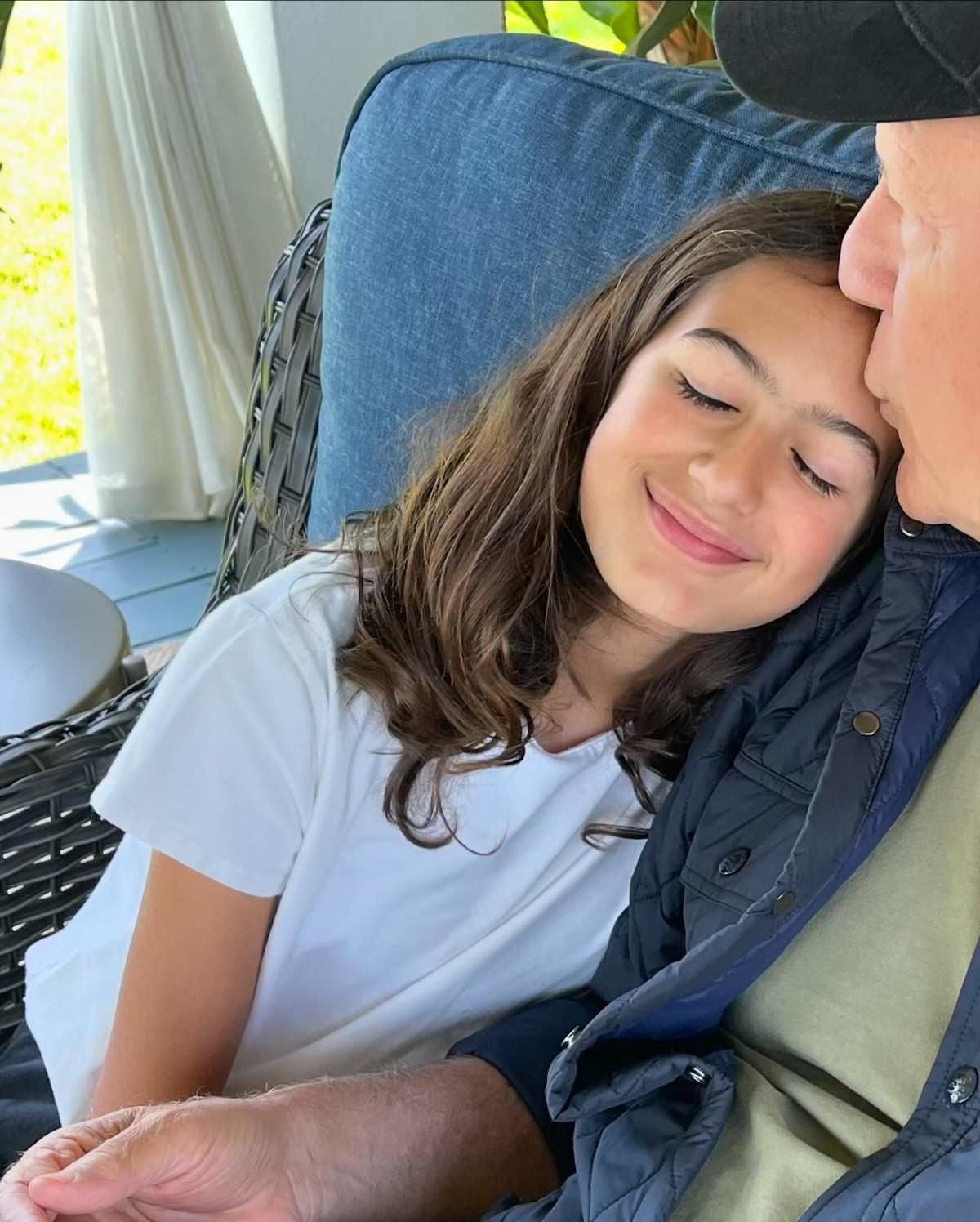 На одной из фотографий Брюс сидит на диване рядом со своей дочерью Скаут, которая нежно касается его щеки, создавая теплую атмосферу.