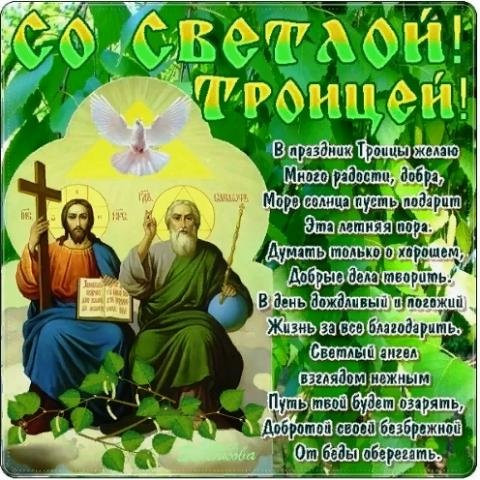 Поздравляю с праздником святой Троицы! Желаю, чтобы небесные Хранители всегда были за спиной. Чтобы горести, печали и невзгоды рассеялись и уступили место миру, радости и покою. Пусть вера в лучшее вместе со свежим летним воздухом поселится в вашем доме. Добра вам и благополучия!